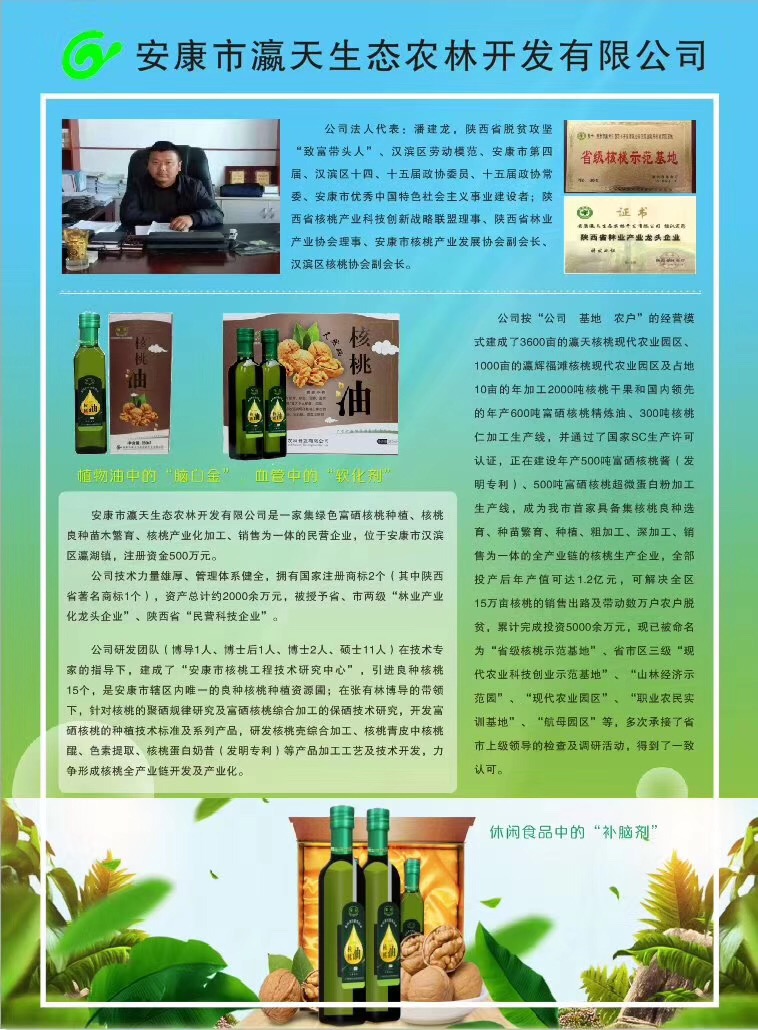 安物以稀為貴,油以硒為本,健康產(chǎn)業(yè)在路上安康市瀛天生態(tài)農(nóng)林開發(fā)有限公司隆重推出:100%純核桃油,通過冷榨而成的木本油料,無任何添加劑, 核桃油中含有92.2%植物性的Ω-3、Ω-6不飽和脂肪酸。